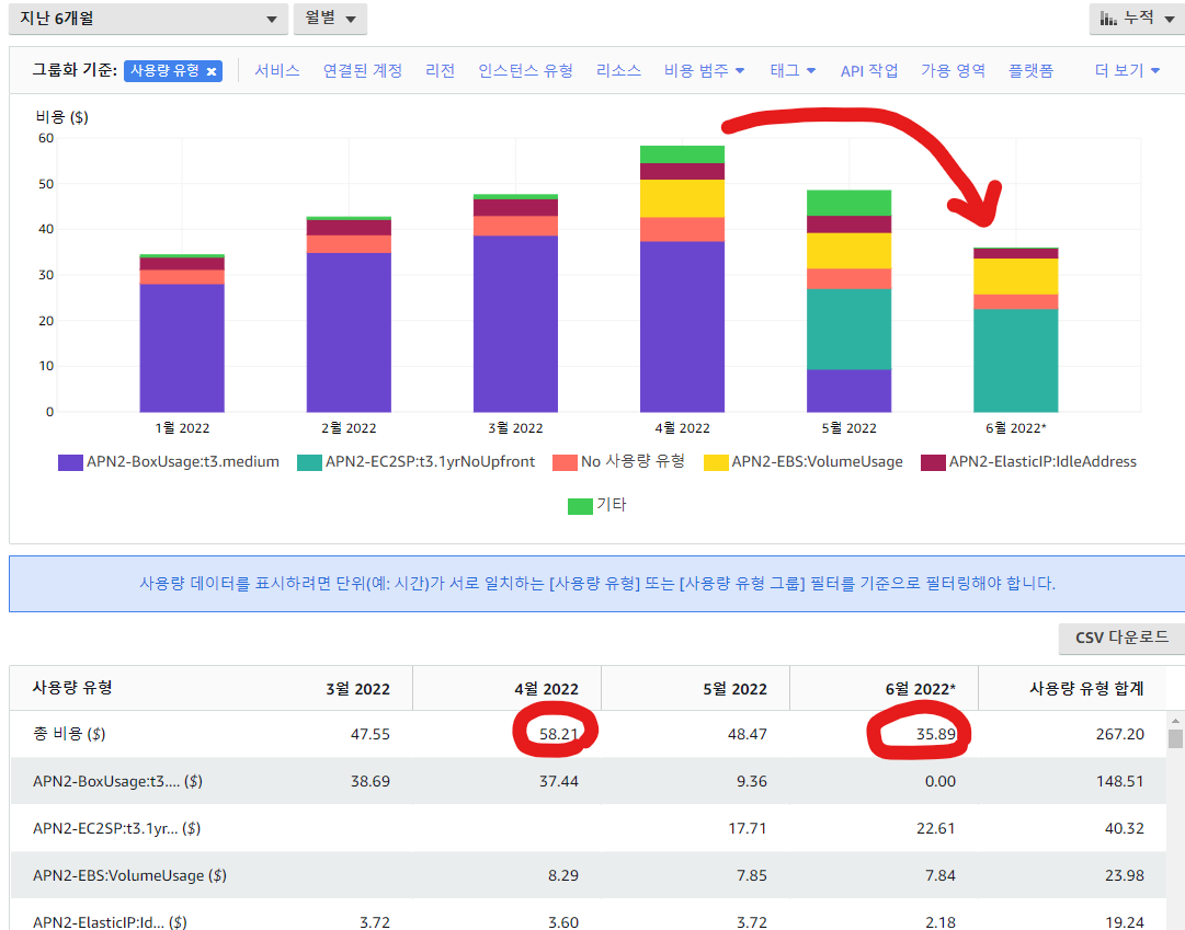 - 5월 한달 간 savings plan 적용하고, 불필요한 요금지출을 막은 결과 22.5$ 정도 절감 효과를 보였음. (38.7% 감소)