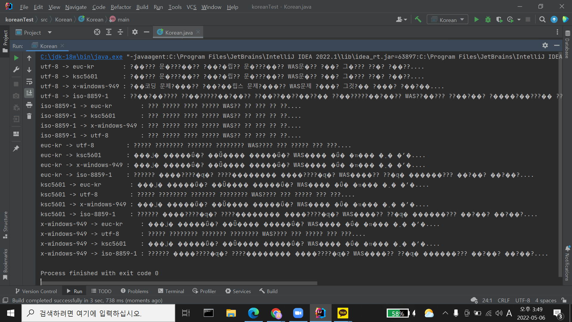 JEP-400(인코딩이 default 로 UTF-8 로 설정되는 기능)이 jdk 18 버전에서 문제를 일으키는 것으로 확인. (Windows 환경)