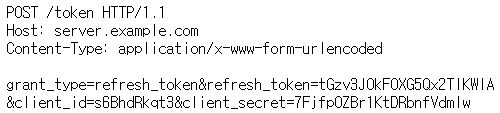 : Http basic 인증 방식(RFC2617)을 사용한다. Authorization 헤더에 "Basic $(password)" 형태로 담아서 전송해도 되고, 또는 request-body에 client_id와 client_secret을 담아서 보내도 된다. 하지만 직접적으로 request-body에 클라이언트 정보를 담는 것을 권장되지 않고, 직접적으로 HTTP Basic 인증 방식을 사용할 수 없는 경우에만 이용하도록 제한한다. request-body에 포함될 정보를 request-uri에 절대로 담아서는 안된다. 액세스 토큰 재발급 요청을 예로 들면 다음과 같다.