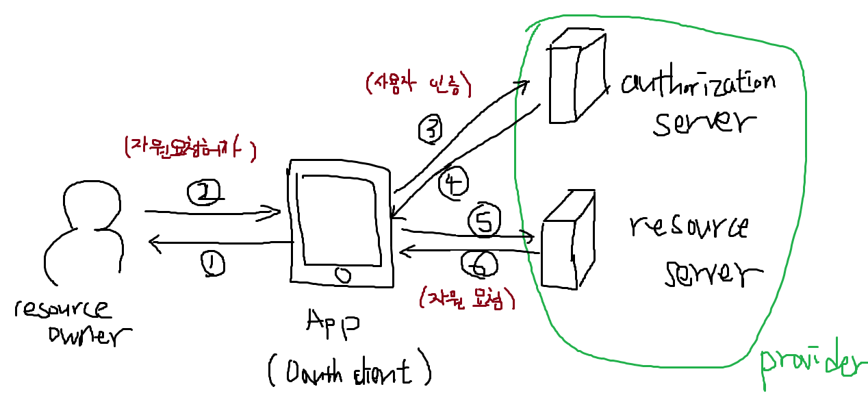 - resource server : 리소소를 hosting 하는 서버를 말하며, access 토큰을 이용해 리소스 요청을 받고 응답한다. (ex. end-user 의 개인정보를 저장하고 있는 naver 서버)
