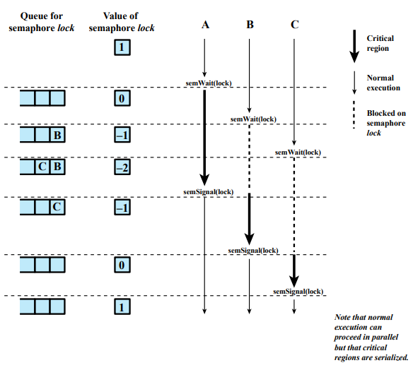 세마포는 위에서 소개된 동기화 방식의 Generalized 된 버전이다. 상호배제 전략과 조건동기화 전략에 모두 사용될 수 있다. 위에서 설명했던 상호배제에서는 flag = 1 이면 자원이 사용중이라 대기해야하고, flag = 0 이면 바로 사용가능한 상태였다. 즉 Critical Section 에 들어갈 수 있는 실행흐름이 단 한개이다. 근데 세마포는 Critical Section에 들어갈 수 있는 실행흐름의 개수를 여러개로 설정할 수 있다. 상호배제의 측면에서는 자원의 개수로 볼 수 있고, 조건동기화 측면에서는 조건(상태)로 볼 수 있다.
