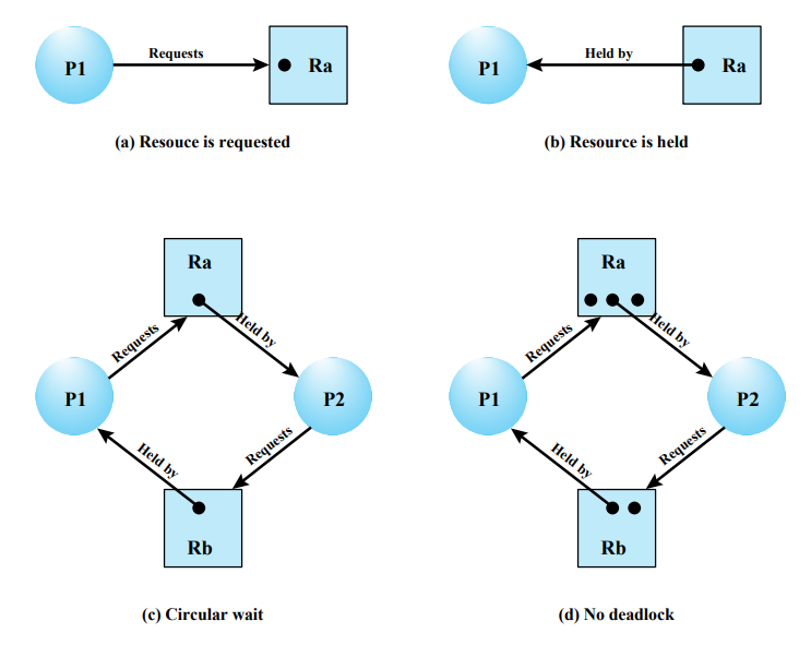 이 그래프에서 순환 의존 관계가 발생하게 되면 데드락이 발생할 수 있다. 그림 (c)는 데드락이 발생한 상황이다. 그림 (d)는 데드락 상황은 아니지만, 추후에 얼마든지 데드락이 발생할 수 있다.