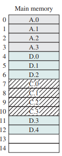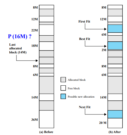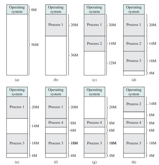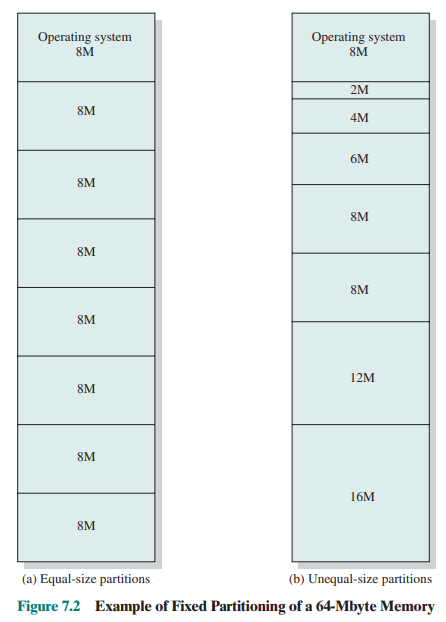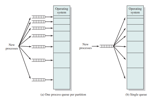 참고로 비균등 할당 방식에서는 프로세스를 할당하는 전략이 다양해질 수 있다. 어떤 프로세스가 메모리 할당 요청을 했을 때, 가장 최적 크기의 파티션이 사용 중에 있으면 (a) 해당 파티션의 프로세스가 swap out 될 때까지 기다리거나 (b) 가용한 파티션 중에서 골라 들어간다.