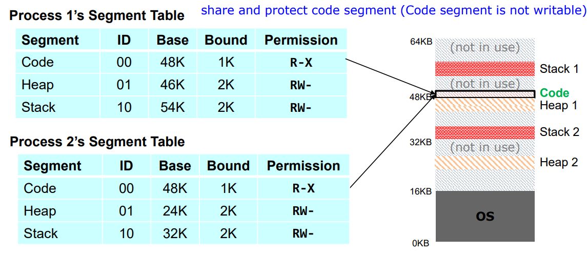 - segment table 이 필요한데, 각 segment 의 시작주소와 길이를 저장한다. 또 접근 권한이라던가 readonly 속성등 부가적인 정보를 함께 나타낸다.