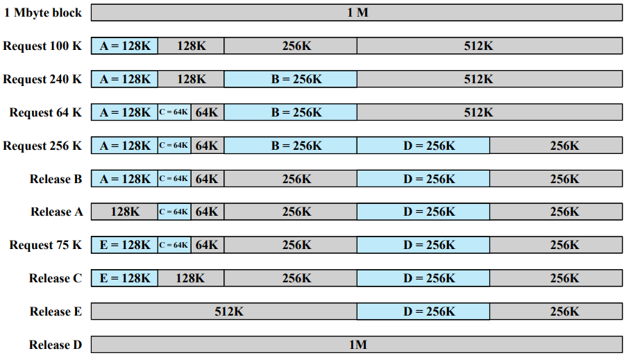 - 프로세스 A가 100K 메모리를 요청 -> 128K 단위로 블럭을 쪼개서 할당한다.