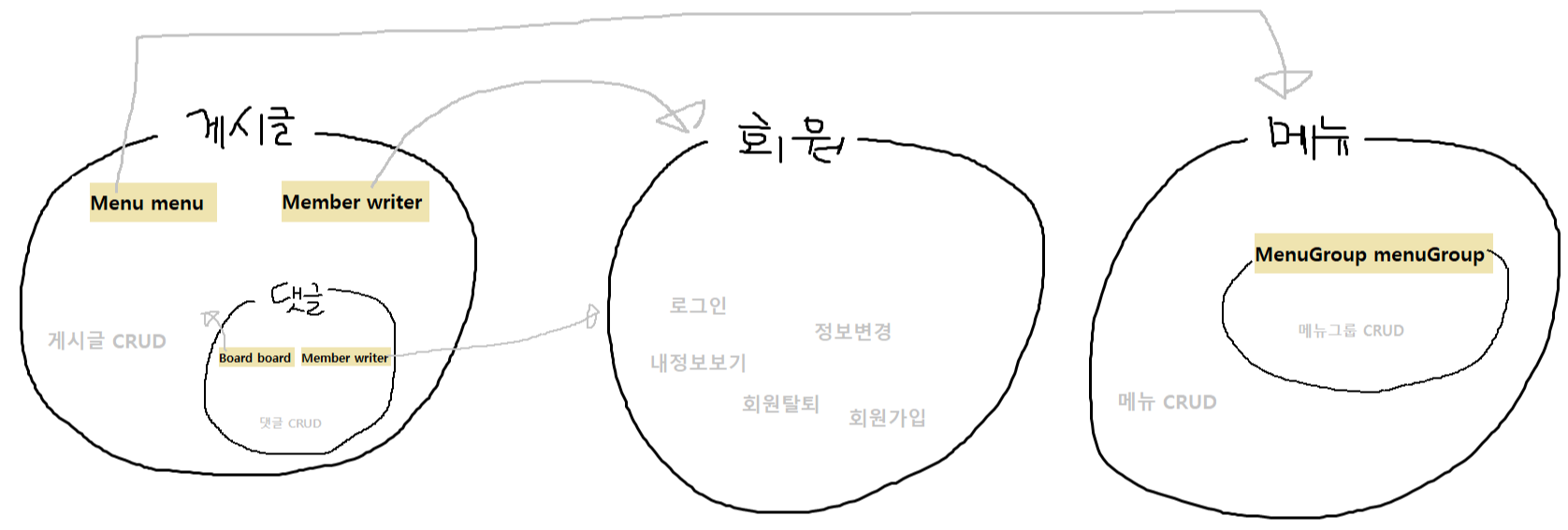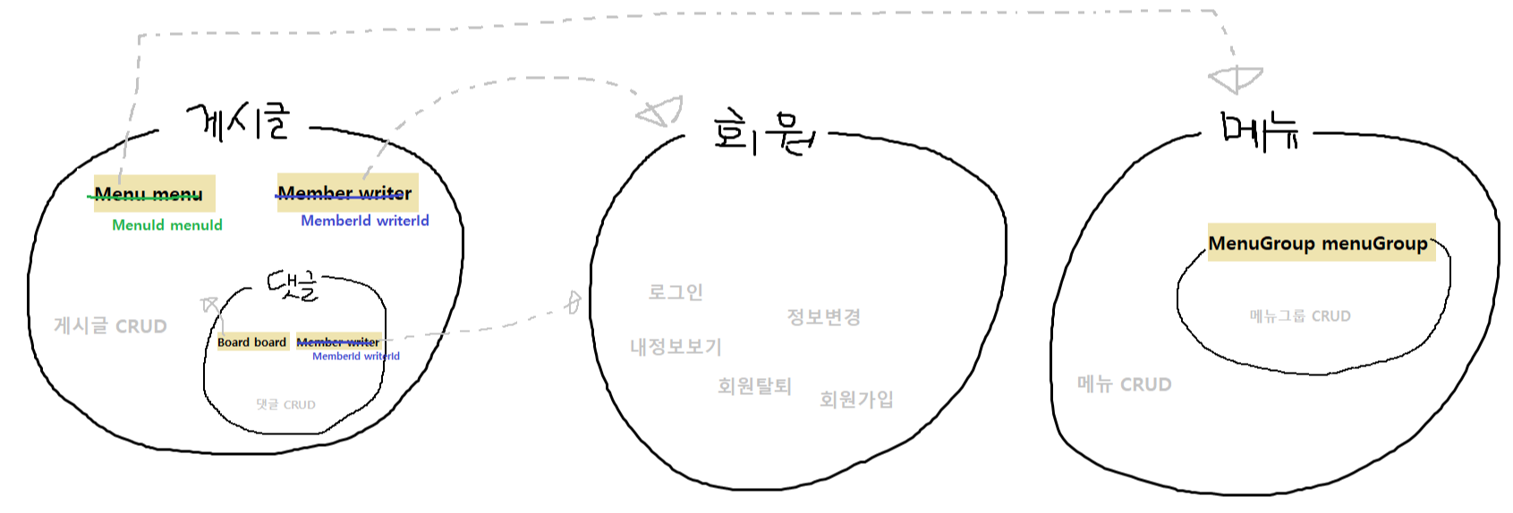 그래서 기존에 짰던 게시글 도메인에서, 회원도메인과 메뉴 도메인을 분리하기로 했다.