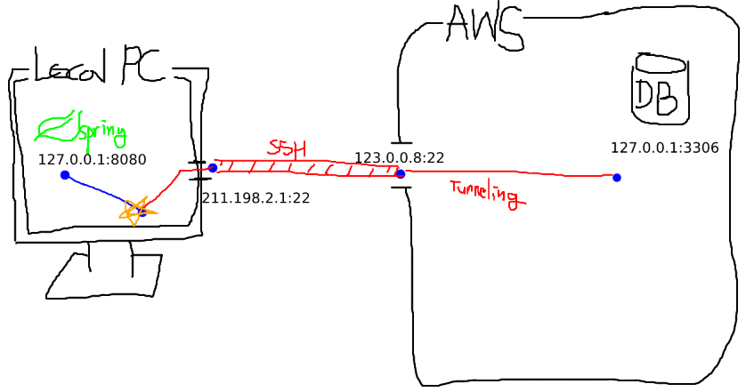 - 로컬 내부에 사용하지 않는 포트 한개를 임의로 잡아서, ssh tunnel 연결해준다.