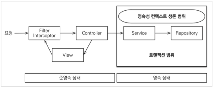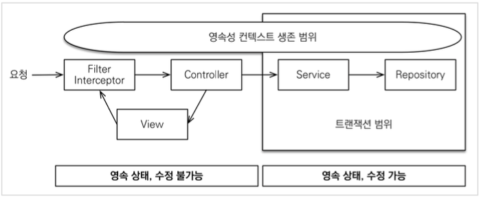 처음 db와 커넥션을 연결한 순간부터 api 반환까지 영속성 컨텍스트를 유지한다.