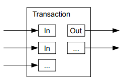 입력은 토큰을 받는 것, 출력은 송금하는 것을 의미한다. 입력은 여러 곳에서부터 들어올 수 있는 반면, 출력은 최대 2개로 정의된다. 하나는 실제 값을 지불하는 것이고, 나머지는 트랜잭션의 남은 금액을 거스름돈으로 자신에게 다시 보내는 것이다.