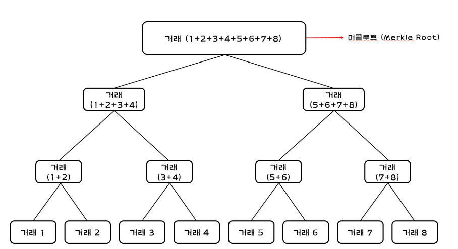 리프노드인 트랜잭션을 제외한 모든 내부노드들은 SHA256 해시 결과인 32bytes 의 해시값을 갖는다. 이 모든 해시값을 저장할 필요 없이 머클루트만 저장함으로써 특정 트랜잭션에 대한 검증을 용이하게 한다.
