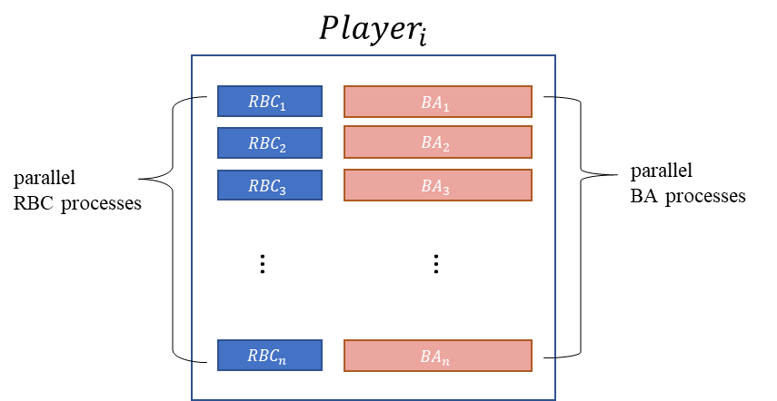 - Each player RBC-broadcasts its \(x'\) with encrypted, triggering other players RBC protocols. Finally the RBC protocol decides as RBC-deliver is successfully done and proposes 1 to corresponding BA process.