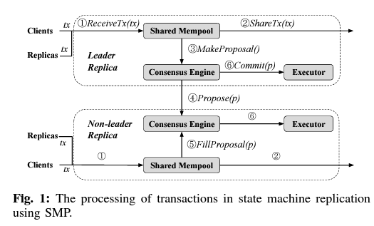 - The implementation of the SMP abstraction modifies the two primitives ReceiveTx(tx) and MakeProposal() used in the traditional Mempool and adds two new primitives ShareTx(tx) and FillProposal(p)
