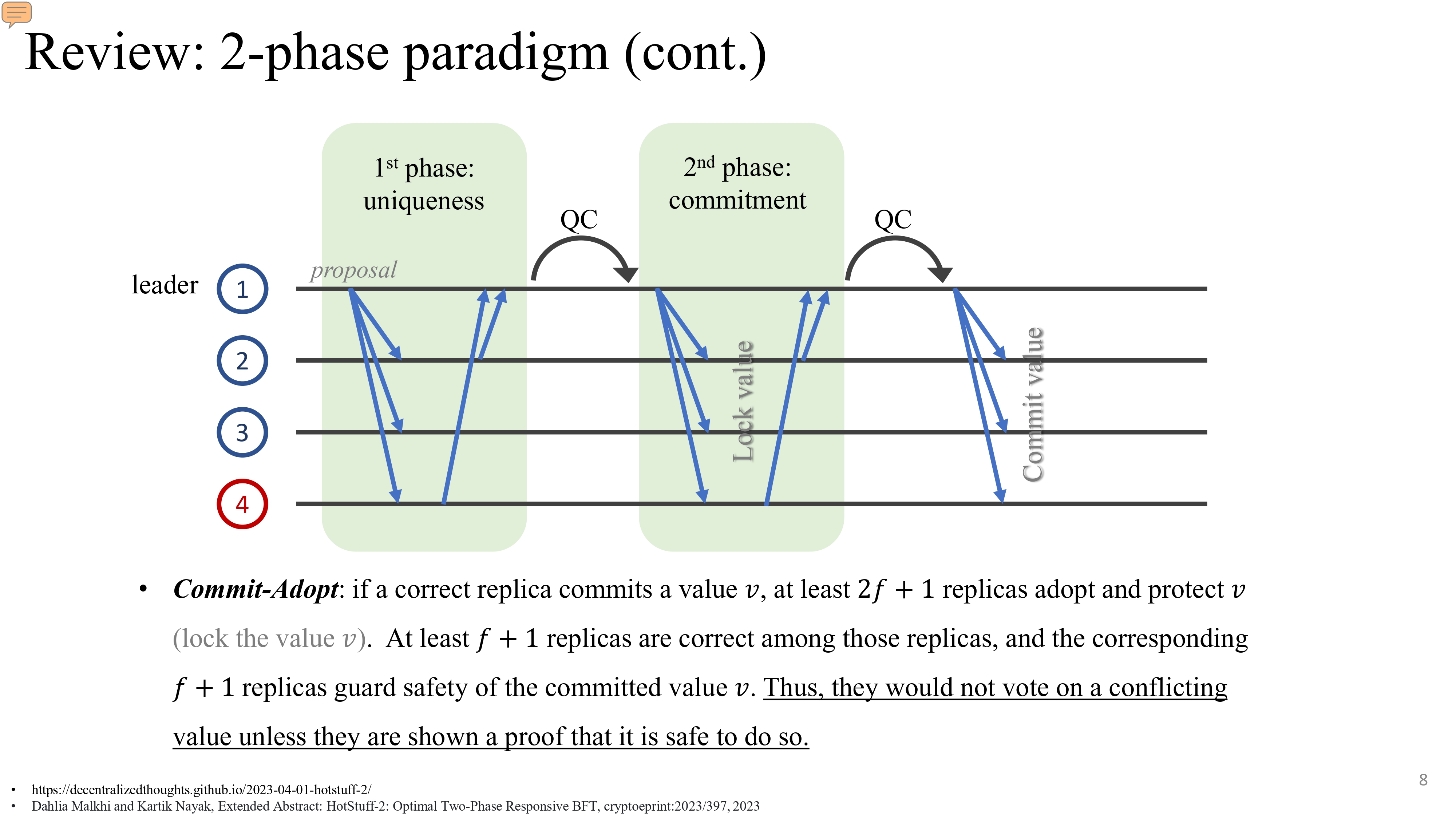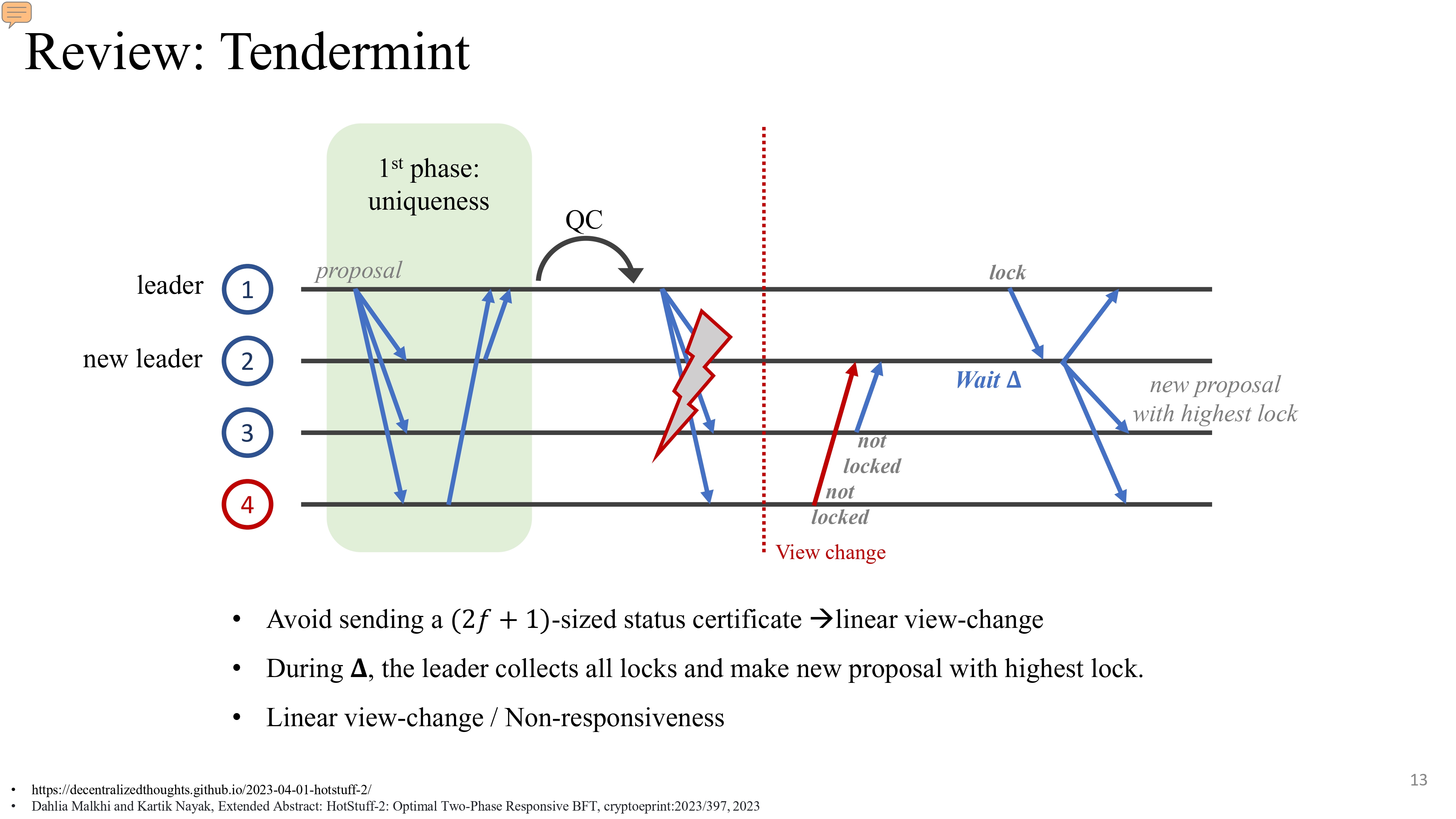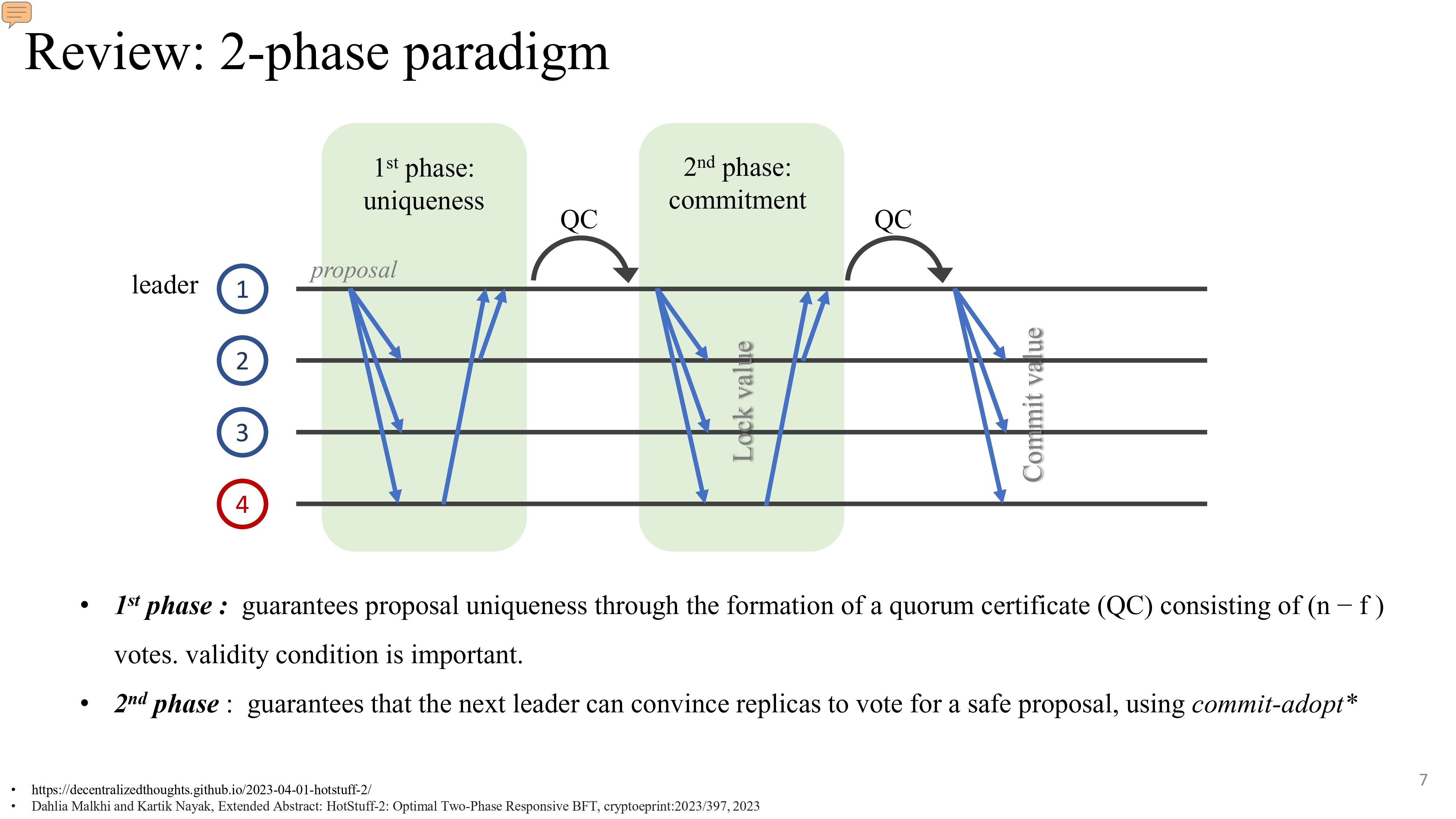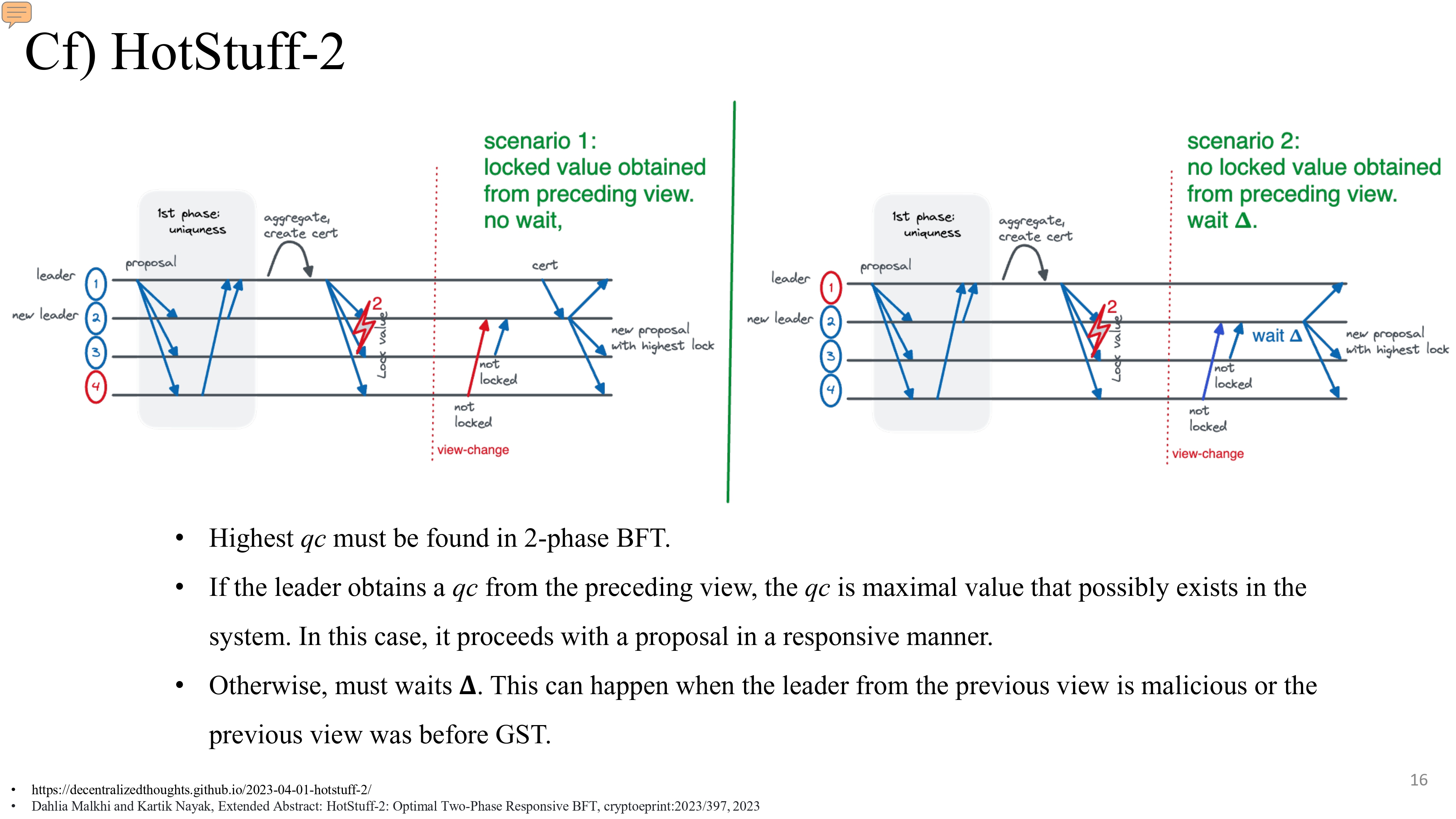 저자인 Dahila Malkhi 가 HotStuff-2 를 새롭게 제안했다. paper 는 작성중인 draft 만 발견할 수 있다. 이번 세미나 자료에는 hotstuff-2 에 대한 간략한 개념도 포함했다.