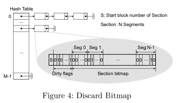Lastly, discard bitmap and discard log are developed to keep track of the newly invalidated filesystem blocks and to restore the filesystem from any crashes, respectively. A discard bitmap represents the newly invalidated filesystem blocks since the last checkpoint in per-section basis. IPLFS organizes a set of the discard bitmaps using the hash table and the section number is used as a hash key. In each checkpoint, IPLFS constructs the discard commands with the hash table and removes the discard bitmap from it. Then, IPLFS dispatches the commands to a separate thread.