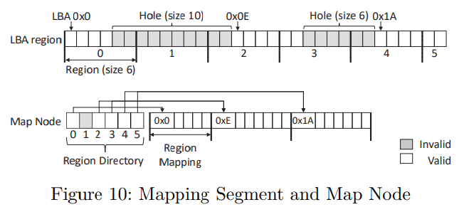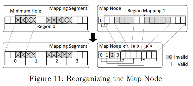 To reduce the map node size, map node compaction is proposed. If the mapping efficiency becomes smaller than a certain threshold, FTL reorganizes the map node by removing holes (invalid flash pages) in the corresponding mapping segment so that only one consecutive array of valid blocks should be in the region.