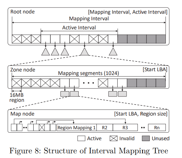 Interval mapping is developed for space-efficient LBA-to-PBA mapping using three-height of interval tree. The six data partition have their own interval mapping tree. Root node consists of an array of zones and each zone node consists of 1024 map nodes as its child nodes. Map node consists of three components: the range of the mapping segment, region directory, and the array of mappings for individual regions. For efficient management of the interval tree, two core technique are proposed: (1) fixed-region mapping and (2) map node compaction.