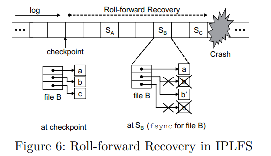Meanwhile, to mitigate storage leak, IPLFS saves the commands as logs at dedicated area of the in-memory checkpoint pack prior to issuing them to the storage. When the system crashes, IPLSF recovers the commands in two phases: reconstructs the commands with respect to the logs in the most recent checkpoint pack and identifies the past changes from the checkpoint using fsync-ed files.