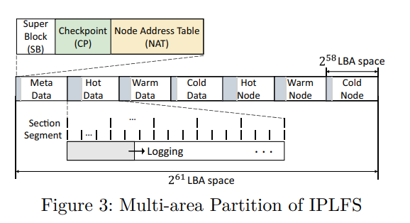 Firstly, IPLFS has six logs, each of which accommodates the filesystem blocks of the same type and hotness level so that maintains the size of the actively used regions small. MSB 3 bits of the LBA address are used as the area identifier.