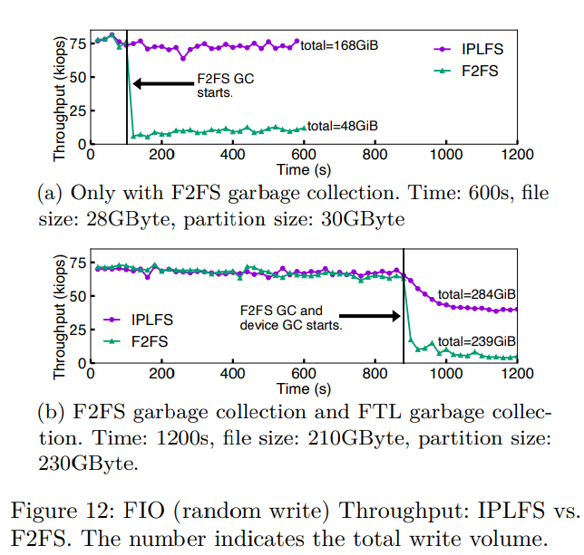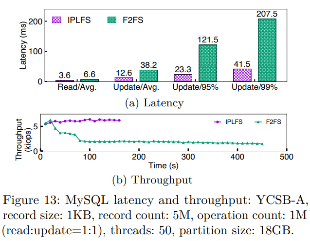 Under FIO workload, the performance of F2FS drops to 1/10 when it starts to perform garbage collection while IPLFS performance remains steady. Under YCSB-A workload with MySQL, the average read latency and the average update latency of IPLFS are 1/2 and 1/3 of those of F2FS, respectively. Moreover, tail latencies of update at 95% and at 99% in IPLFS are 5.2× and 5× lower than those of F2FS.