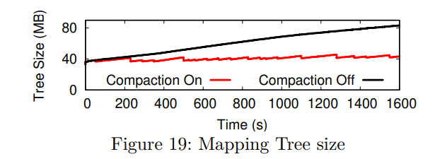 Furthermore, the effectiveness of map node compaction was examined with a 160GB file. Without compaction, the mapping tree size increases as the filesystem ages and reaches over 80 Mbyte. On the other hand, the mapping tree size stays at around 40 MB with compaction. Mapping table size remains almost the same as the mapping table size for 160 GB even though the active interval expands to 305 GB.