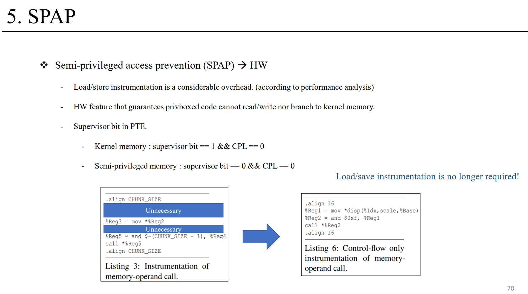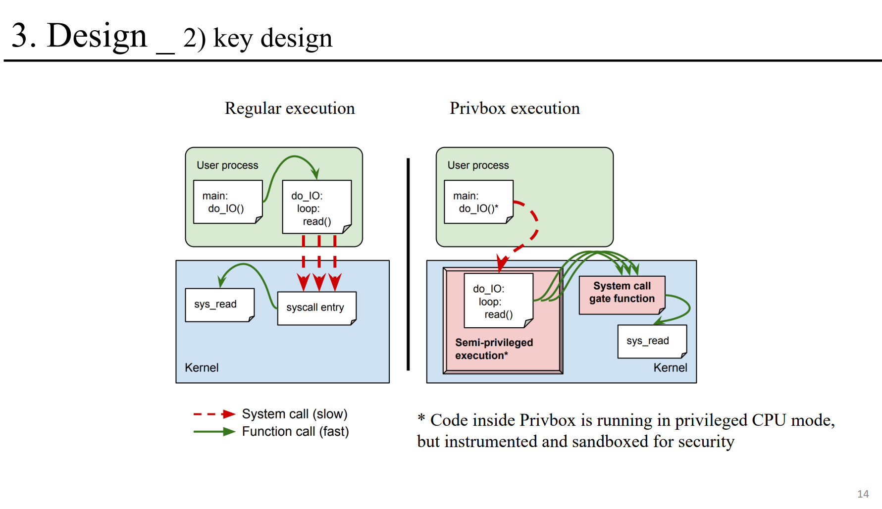 We further propose semi-privileged access prevention (SPAP), a simple hardware architectural feature that alleviates much of Privbox's instrumentation overhead. We implement Privbox based on Linux and LLVM. Our evaluation on x86 (Intel Skylake) hardware shows that Privbox (1) speeds up system call invocation by 2.2 times; (2) can increase throughput of I/O-threaded applications by up to 1.7 times; and (3) can increase the throughput of real-world workloads such as Redis by up to 7.6% and 11%, without and with SPAP, respectively.