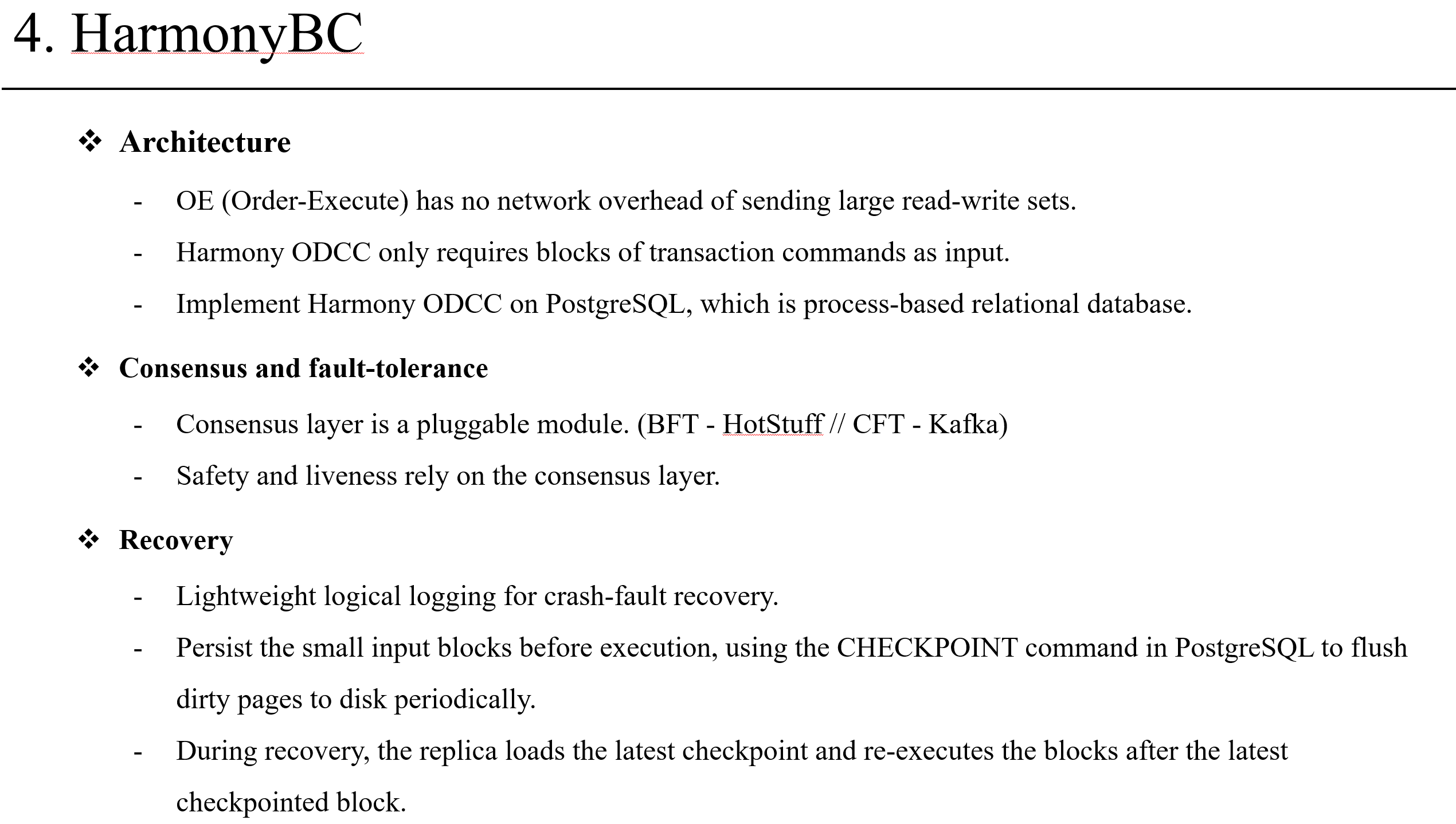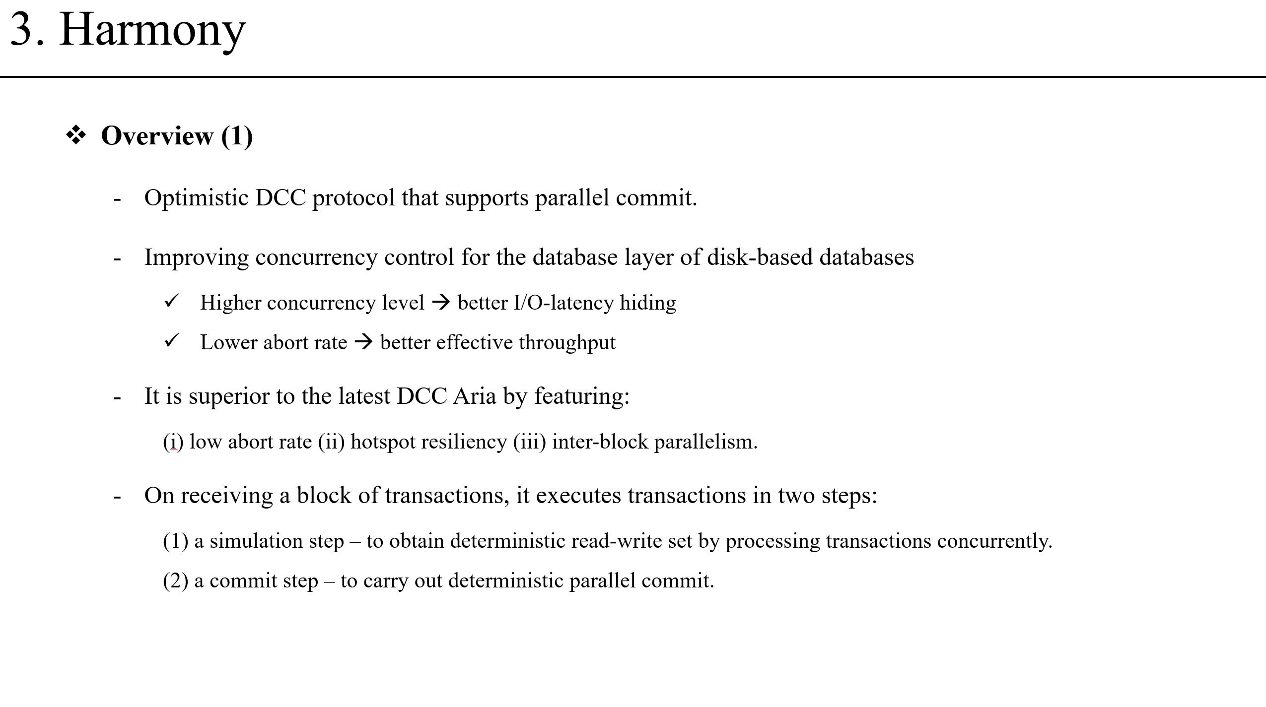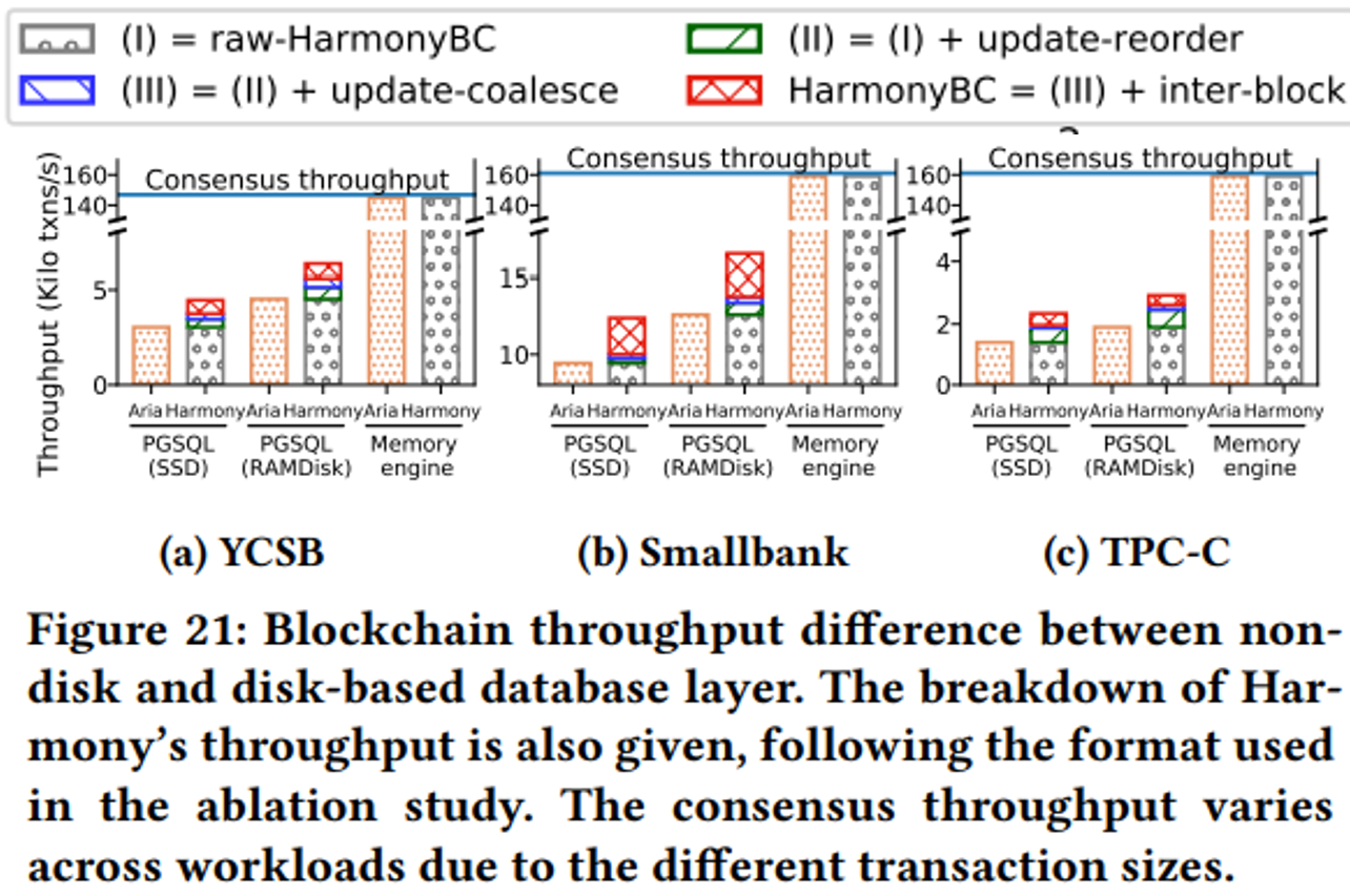 - In the last experiment, the authors pose insightful question: "Harmony’s optimizations are still effective if all disk-related overheads in the database layer are gone?". The results showed that disk-oriented blockchains cannot exceed the throughput of memory-native blockchain.