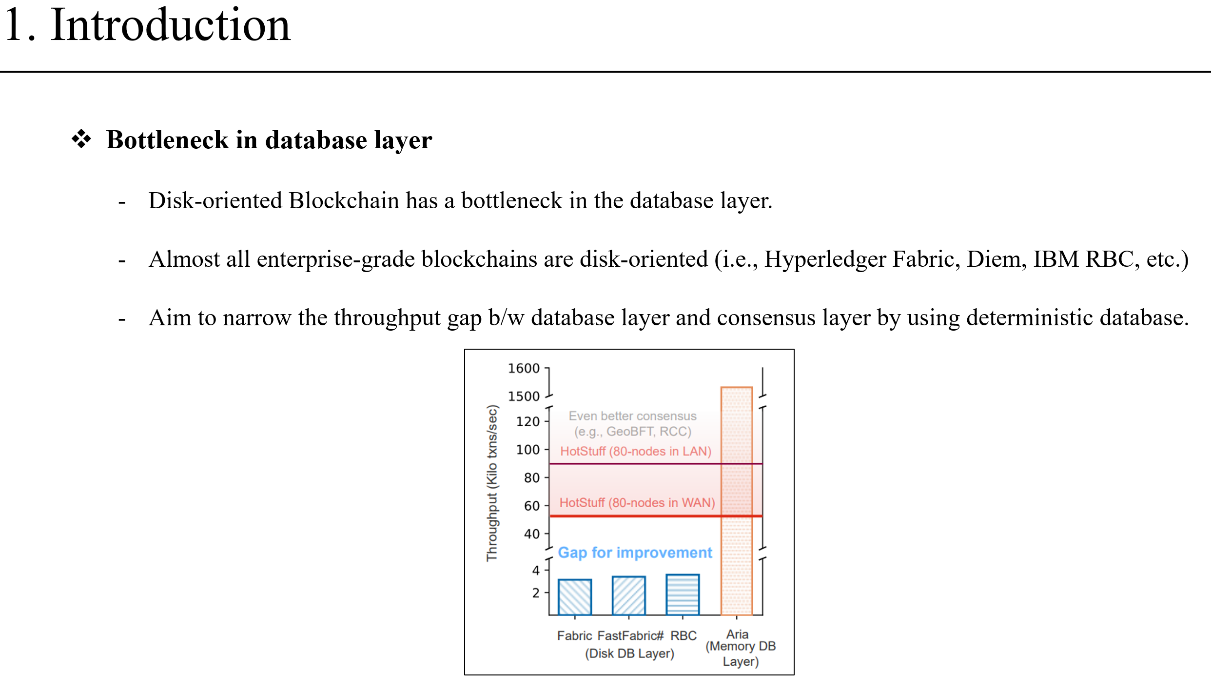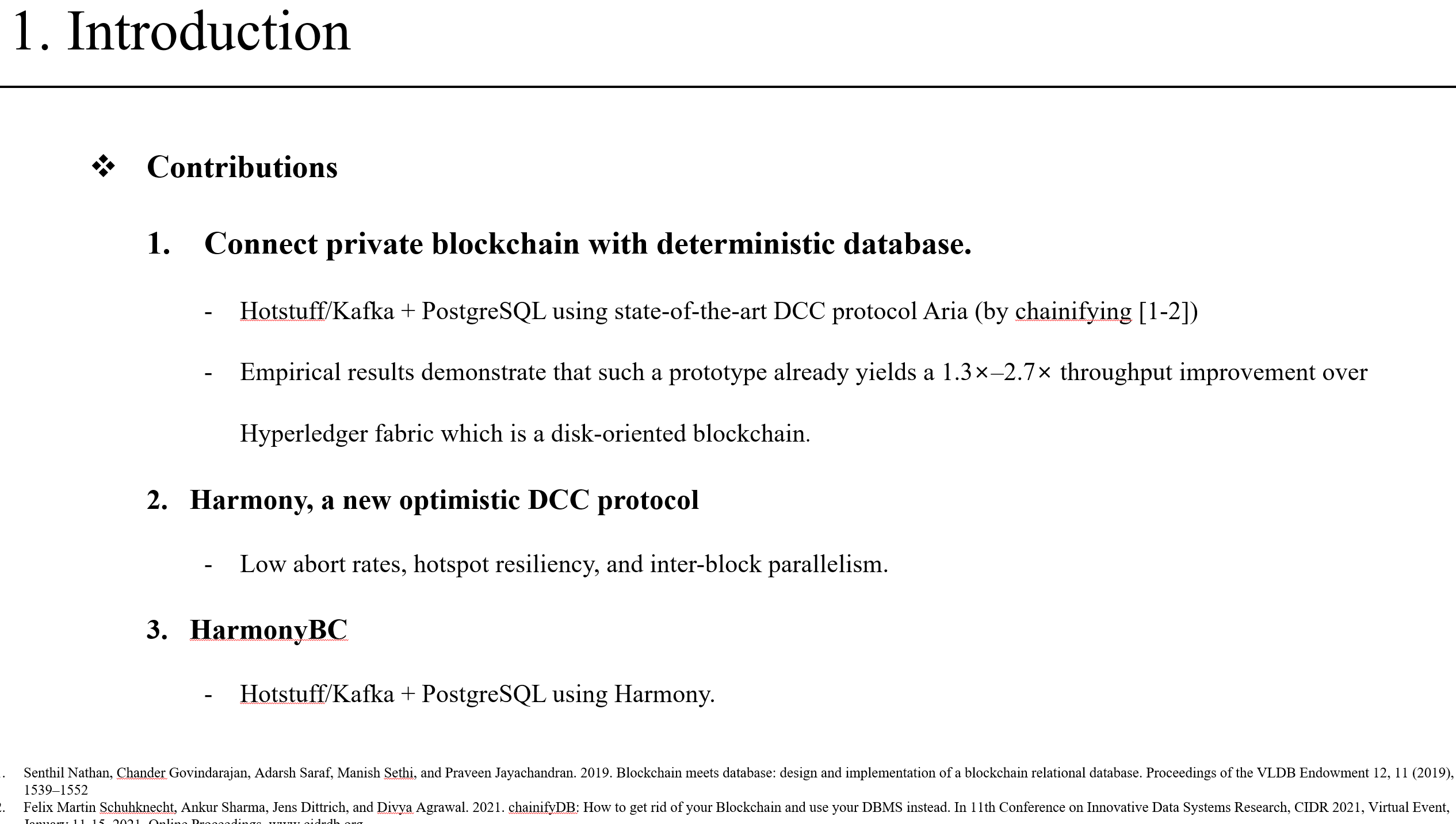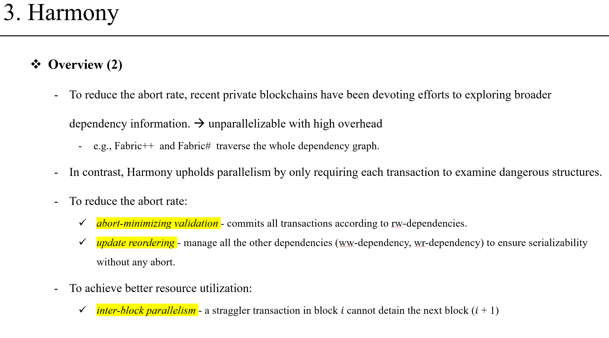 - In the last experiment, the authors pose insightful question: "Harmony’s optimizations are still effective if all disk-related overheads in the database layer are gone?". The results showed that disk-oriented blockchains cannot exceed the throughput of memory-native blockchain.