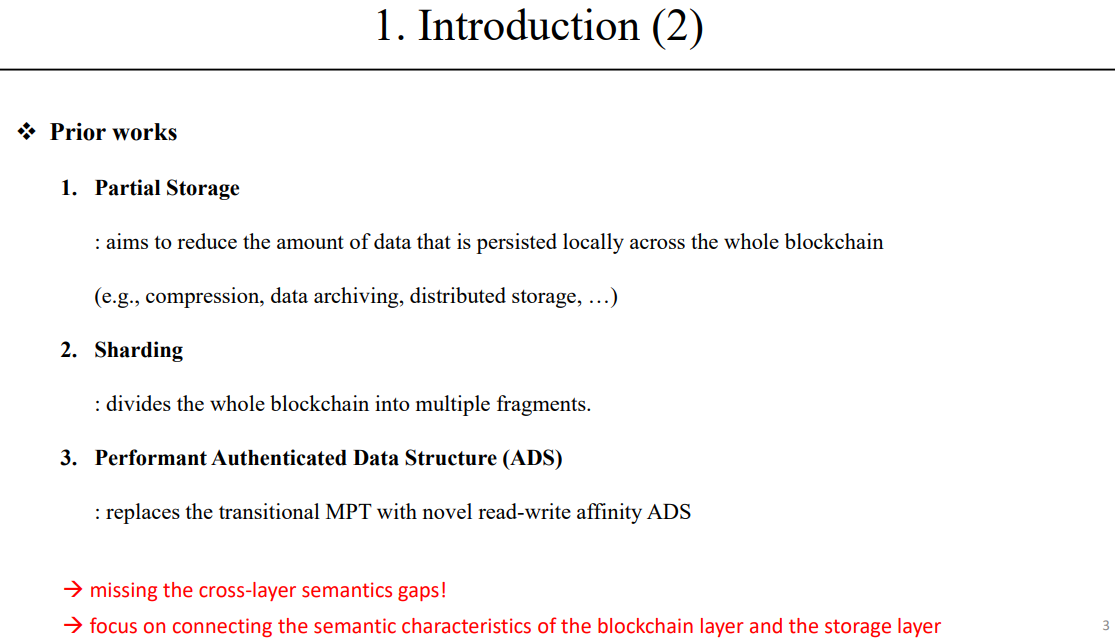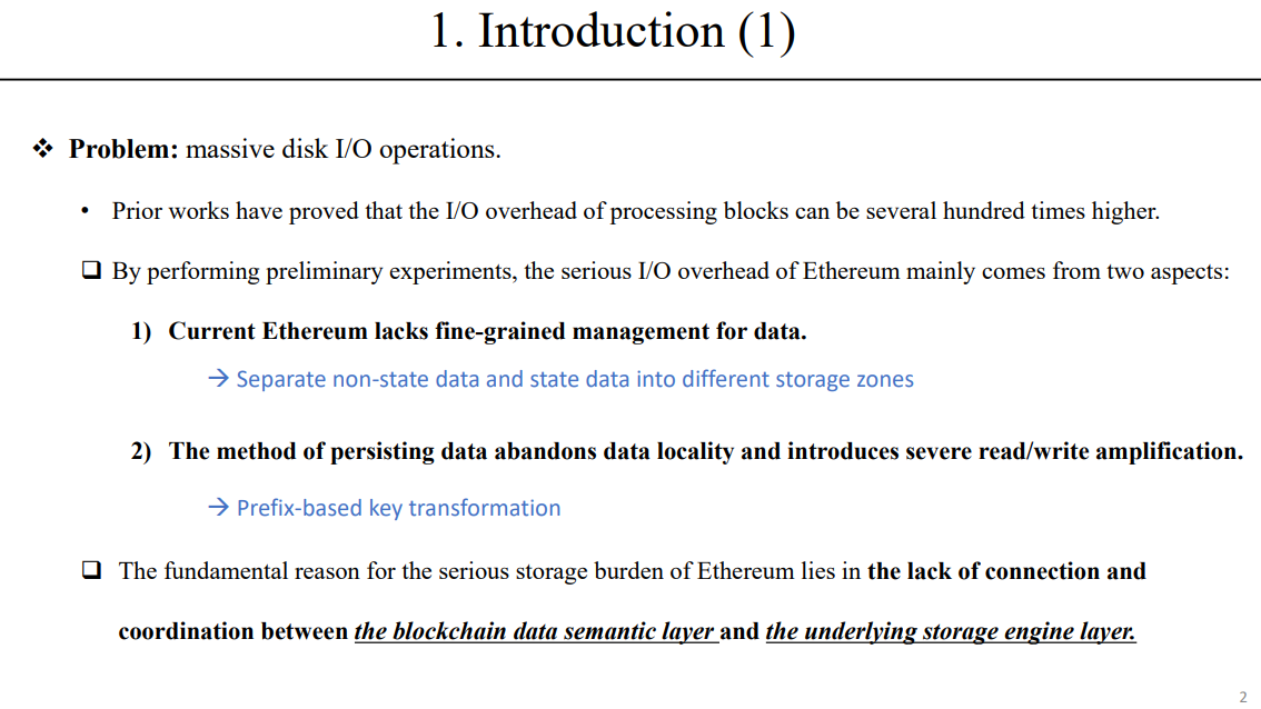 - The Log-Structure Merged tree (LSM-tree) based key-value (KV) store has been widely adopted as the storage engine for blockchain systems, such as Ethereum, in which blockchain data are uniformly transformed into randomly distributed KV items for persistence. However, blockchain semantics are ignored during this process, making the blockchain storage suffer from heavy read/write amplification problems. Moreover, as the Ethereum network scales up, tremendous data further exacerbates its storage burden. Until now, most studies have focused on sharding, data archiving, decentralized distributed storage, etc., to mitigate the burden of the storage layer. However, the incompatibility between Ethereum semantics and the characteristics of the storage engine is ignored.