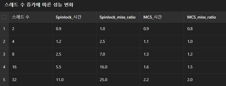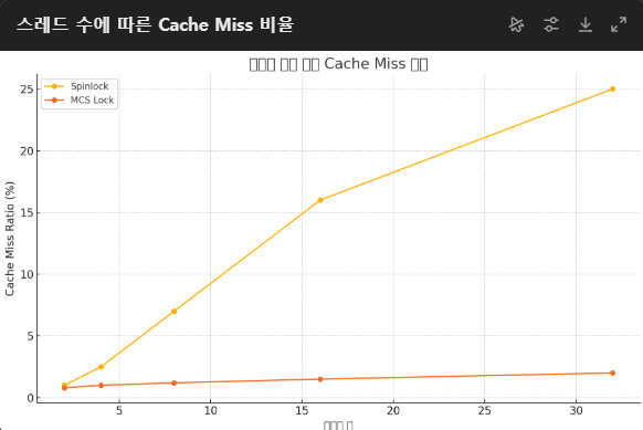 위 결과를 보면 스레드 수가 늘어날수록 Spinlock과 MCS Lock의 성능 격차가 확실하게 커지는 것을 확인할 수 있어요: