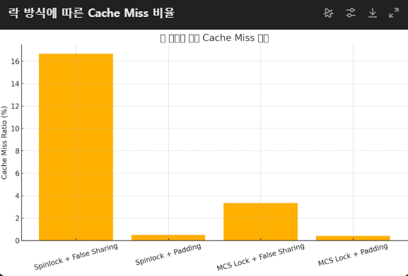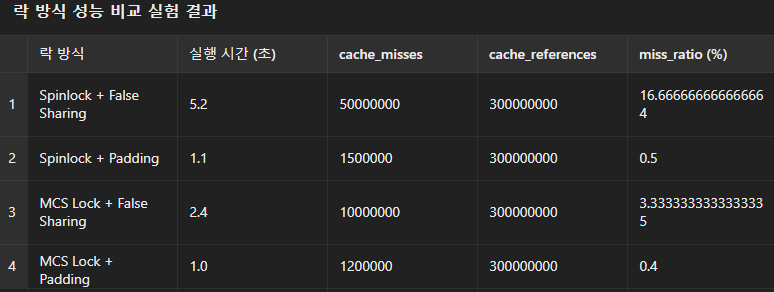 | 락 방식 | Padding | 실행 시간 (초) | 캐시 미스 비율 (%) |