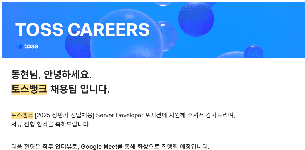 이번 문화적합성 인터뷰는 네이버 면접 ([합격 후기] 2025년 팀네이버 신입 공채 - 인프라) 때와는 다르게, 살아온 환경과 여태까지 했던 프로젝트들, 여지껏 겪어왔던 내 인생을 중요한 순간들을 열심히 돌아보았다. 인생 회고가 면접 때 도움이 많이 된 것 같다. 또 토스의 사내 문화는 독특(?)하기로 유명한데, 토스의 블로그나 유튜브 채널에서 쉽게 확인할 수 있다. 보면서 느낀 것은 내가 살아온 방식이, 토스가 일하는 방식과 굉장히 유사하다는 것을 많이 느꼈다. 준비하면서, 토스에 들어가서 일하고 싶다! 토스는 나랑 딱 맞는 회사다! 라는 생각이 들어서, 면접 전에도 붙을 것 같다는 기쁨이 느껴졌달까... 결국 일주일 정도 뒤에 합격 메일을 받았다!