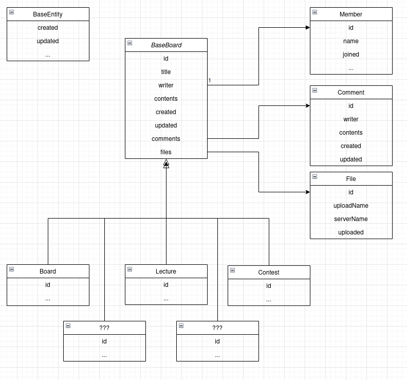 홈페이지 특성 상 게시판 종류가 많다. db table 의 대부분이 게시판. 강의, 공모전, 일반 게시판, 외에도 다른 게시판들이 더 존재.. 아래와 같이 게시판의 공통부분을 BaseBoard 로 묶어주면, 다른 게