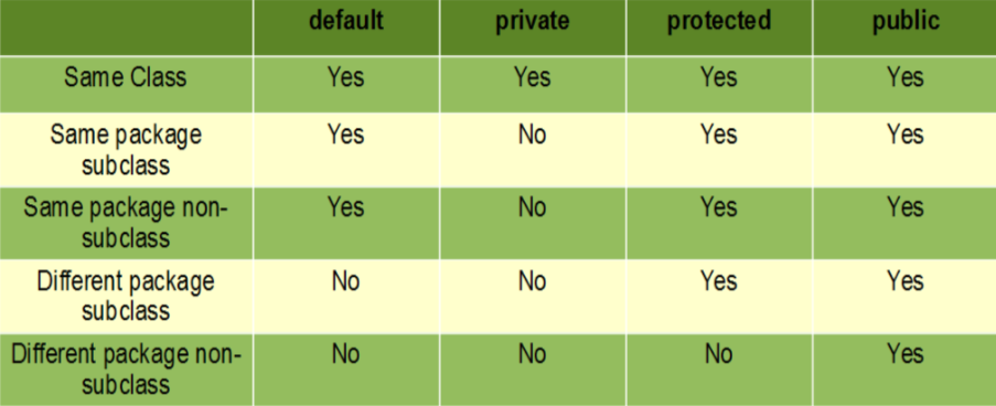 - 접근제어자 : public, protected, default, private