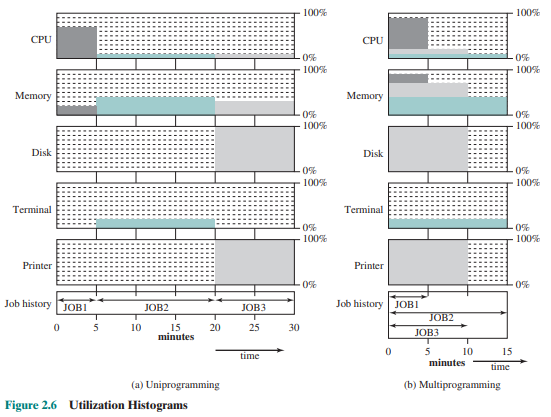 Synchronous blocked io 상황에서 cpu utilization 을 높이기 위해서는, block 되어있는 동안 다른 프로그램을 실행하면 된다. Single Batch System 에서는 메모리에 OS 와 사용자 프로그램 단 두개만 load 되어 있는 상태이다. 이를 uni-programming이라 하고, 따라서 메모리에 2개 이상의 프로그램을 load 하여 상황에 맞게 cpu 를 사용하게 하는 것이 multi-programming 이라 한다. (메모리 관점에서의 용어이다. 흔히 말하는 multi-process는 cpu 관점에서의 용어)