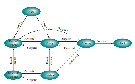 : ready/suspend, block/suspend 두 상태가 추가된 최종 형태이다. suspend는 디스크에 존재한다는 의미이다.