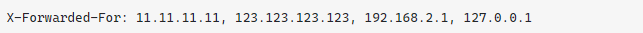 그러면 서버에서 최종적으로 요청을 받았을 때는 아래와 같은 모양이 되고, 클라이언트를 11.11.11.11 로 선택할 수 밖에 없다. 이는 spoofing 공격 방식인데, 이런 공격을 막기 위해 real_ip_recursive 를 활성화하면 set_real_ip_from 으로 선언된 '신뢰할 수 있는' 프록시 서버 목록만을 믿겠다는 것이다. 따라서 192.168.2.1 과 127.0.0.1 만 프록시 서버라고 믿을 수 있으므로, nginx 는 123.123.123.123 을 클라이언트로 보는 것이다.