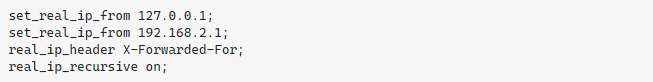 (2) real_ip_header 는, set_real_ip_from 으로 선언한 프록시 서버에서 요청이 들어왔을 때, real client ip 를 찾을 요청 헤더를 명시하는 지시어다. 위의 예시에서는 192.168.1.0/24, 192.168.2.1, 2001:0db8::/32 에서 요청이 들어왔을 때, client ip 를 X-Forwarded-For 이라는 헤더에서 찾겠다는 의미이다.