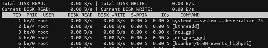 리눅스 iotop 명령어를 이용해서 현재 쓰기작업을 하는 프로세스가 무엇이 있는지 확인했다.