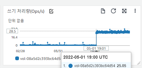 aws 비용 명세서를 보는데 위처럼 ebs IOps(input/output operations per second)가 갑자기 엄청나게 늘어났다. 이전달까지는 2백만 IOs 안쪽으로 기록됐는데, 이번달은 6천만 IO가 넘어가서 추가요금이 발생하는 상황이었다. 평소보다 30배 이상 증가한 셈이다. 바로 cloud watch 에서 모니터링 지표를 확인했다.